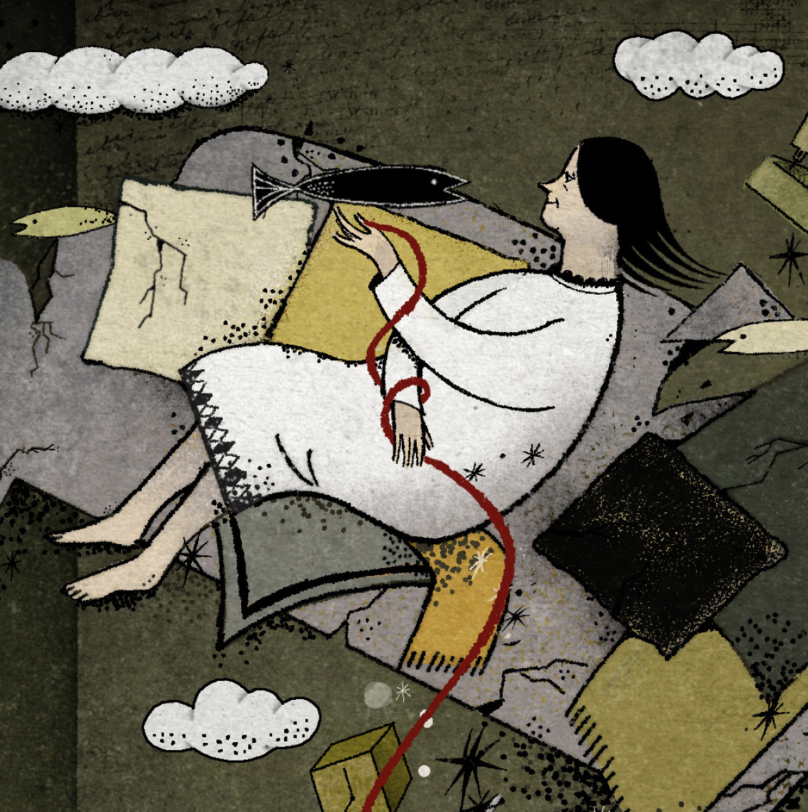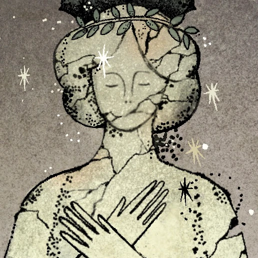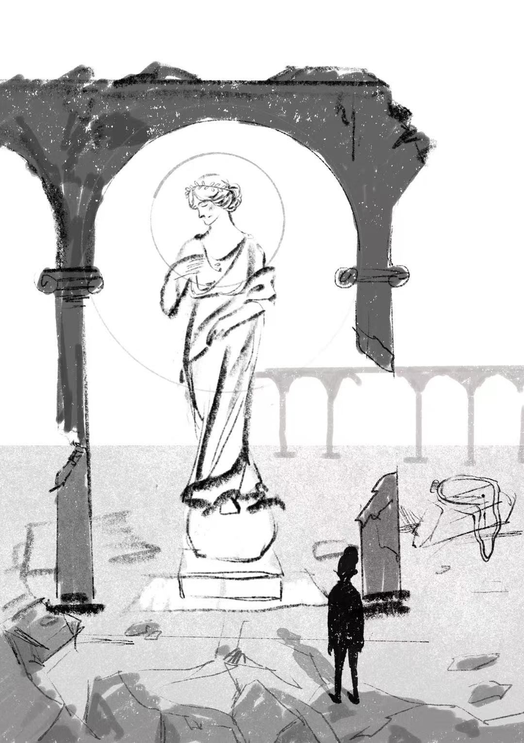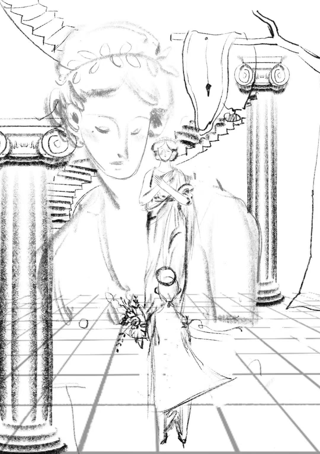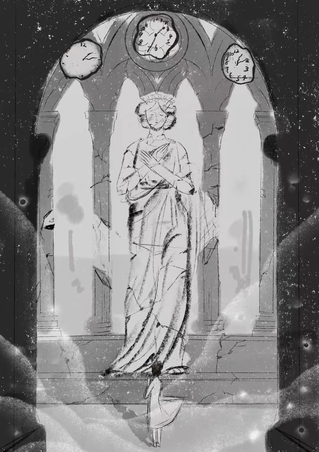 Visualizing the mother as a monumental figure of faith. As this pillar fractures, the daughter reaches out, desperately trying to catch the floating debris to patch the cracks—an impossible attempt to hold together a disintegrating identity.