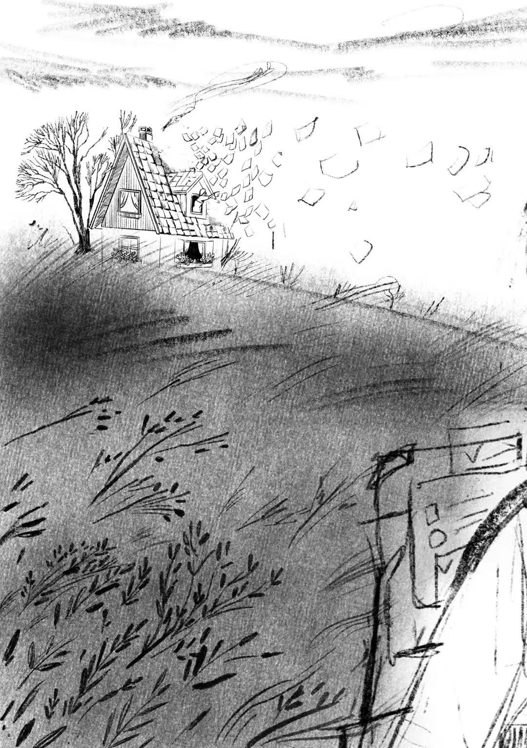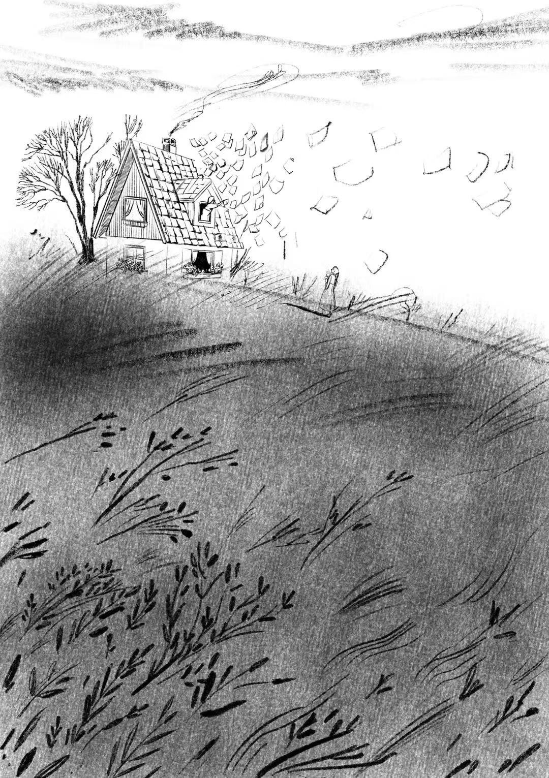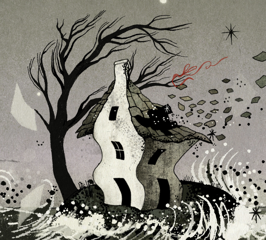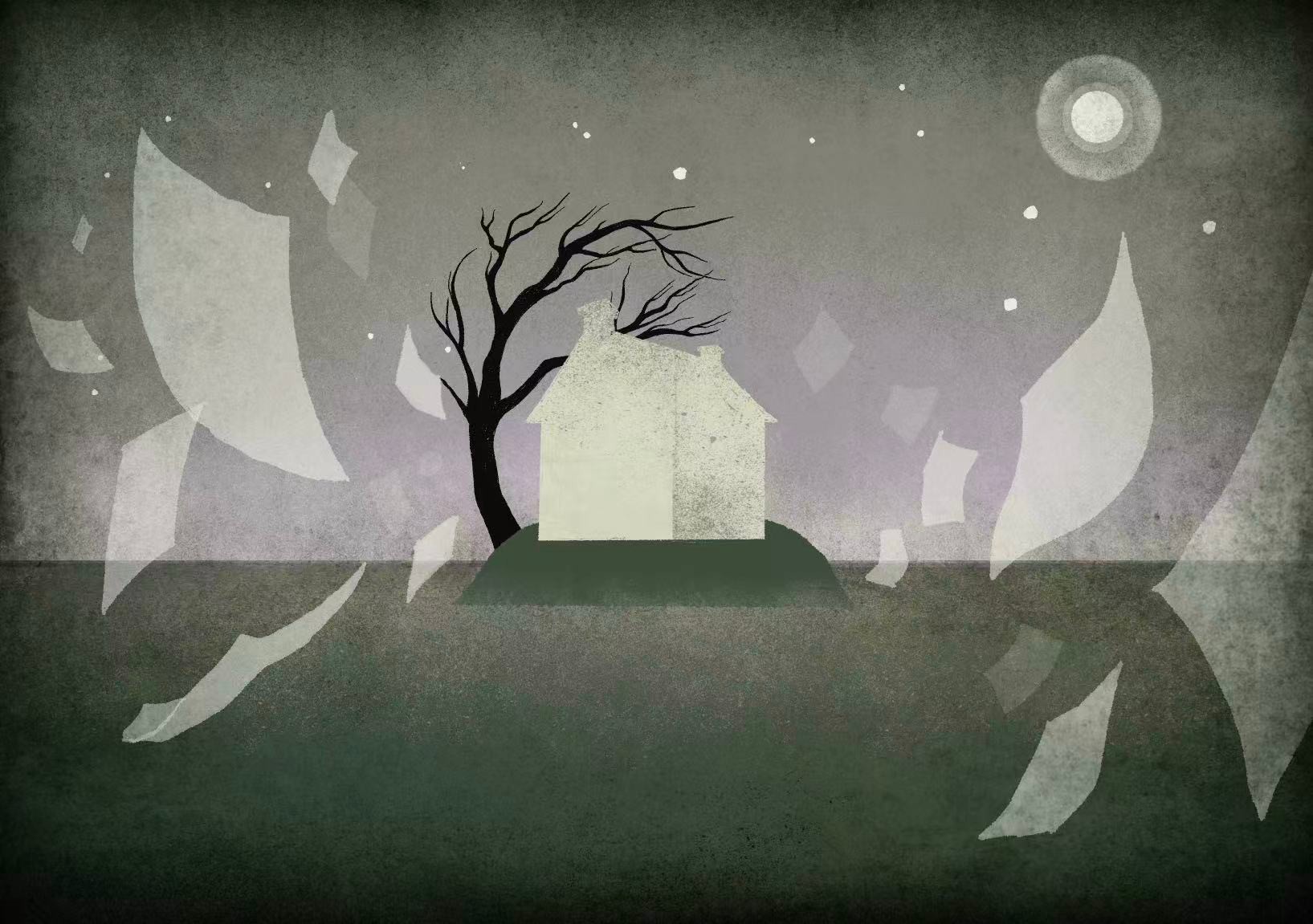The Island: Symbolizing the final stage of isolation. A solitary house sits on a desolate island, surrounded by a dark sea and flying pages of lost names, representing the complete erasure of language and connection.