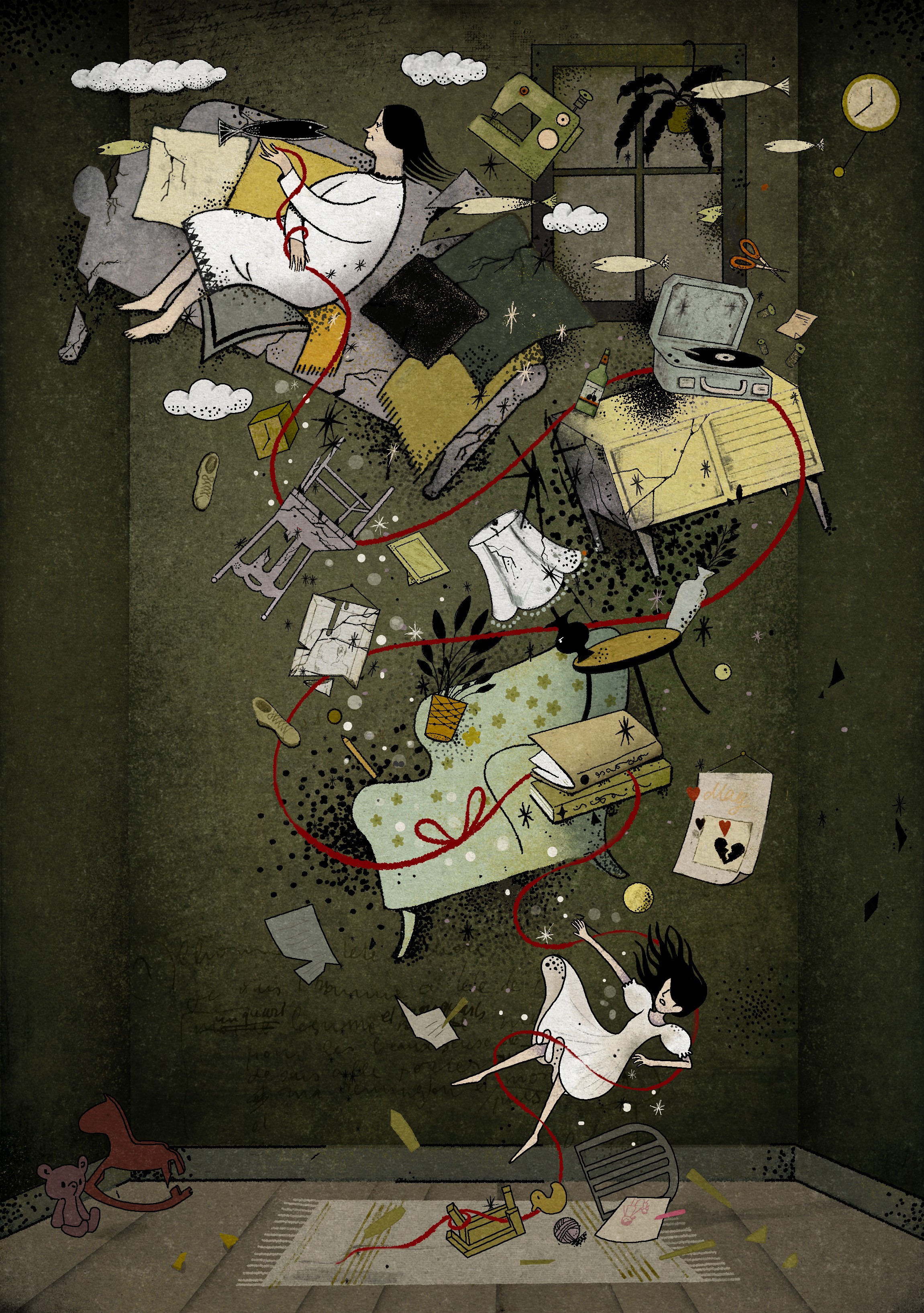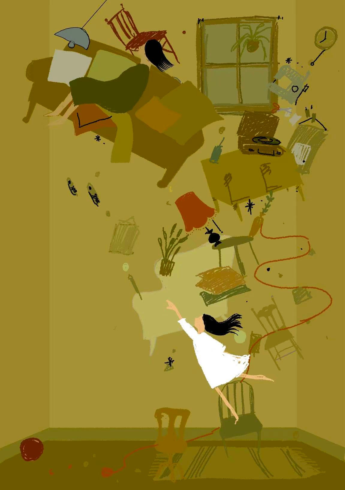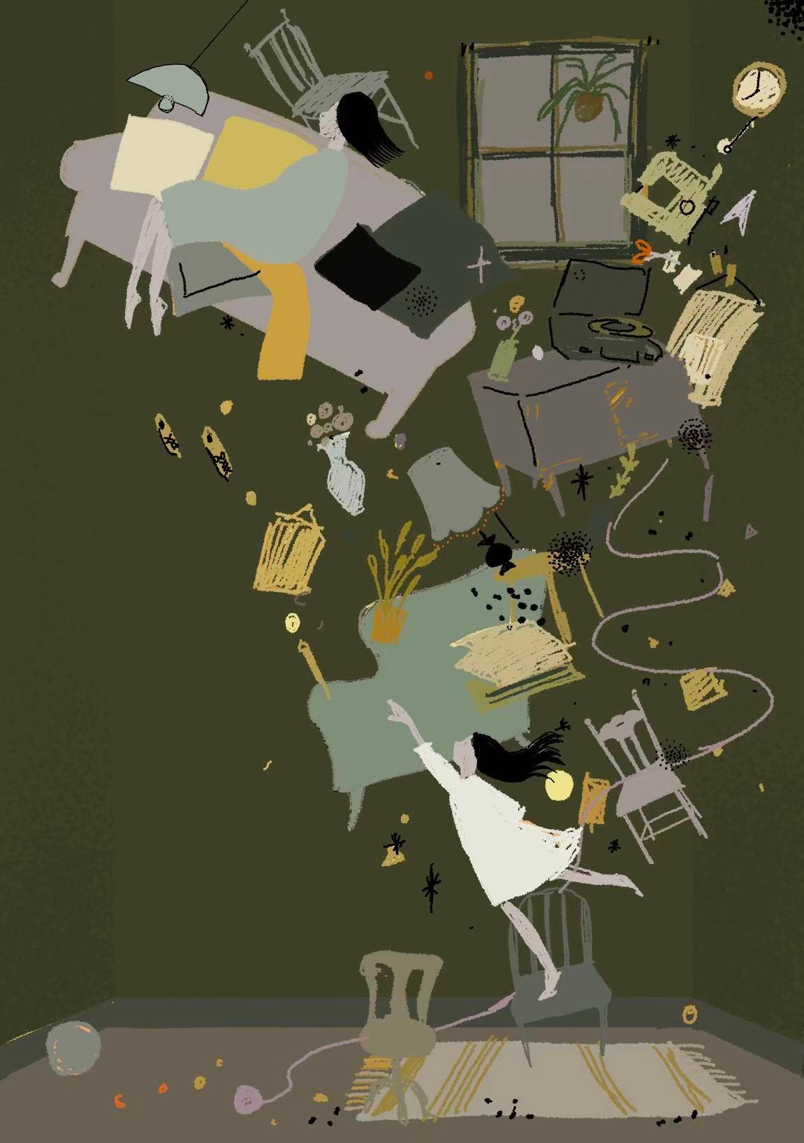 The Interior: Visualizing the futility of caregiving. It captures the tragic moment where the daughter reaches out to catch her falling mother but fails. As the mother is pulled downwards into the void, the "home" dissolves around them, depicting the gravitational pull of forgetting.