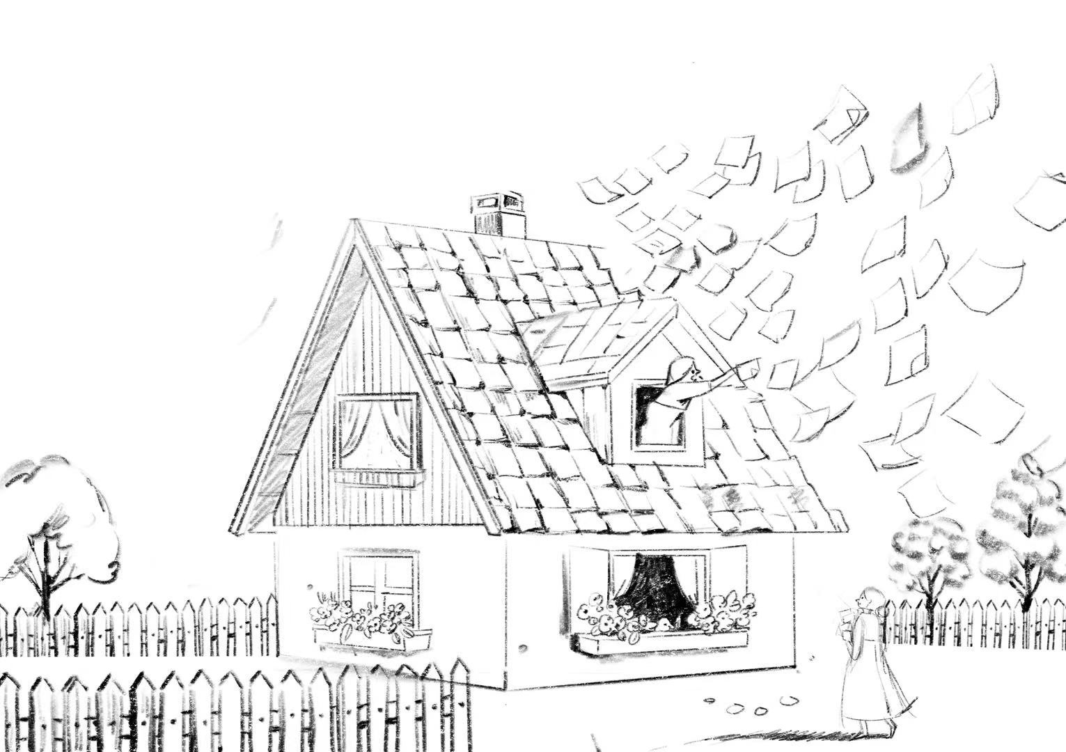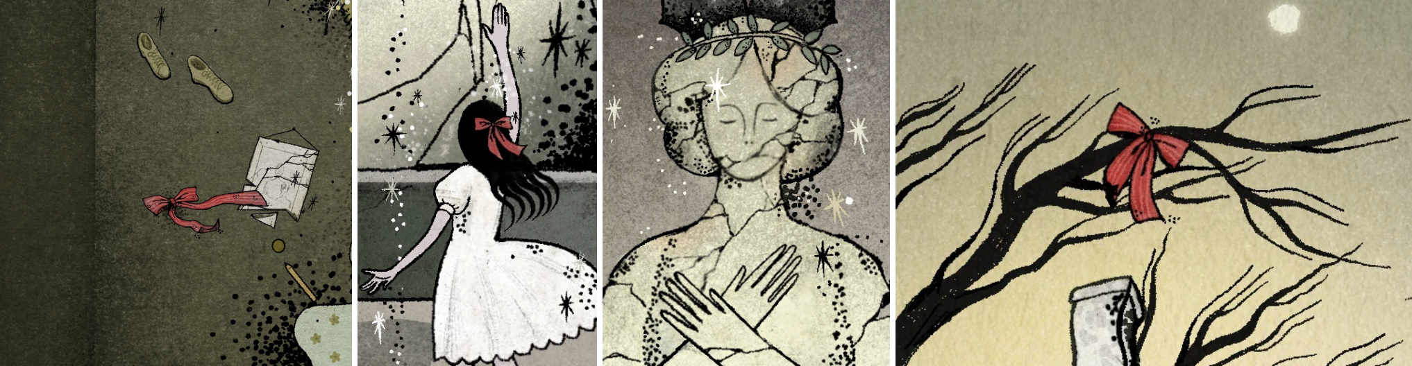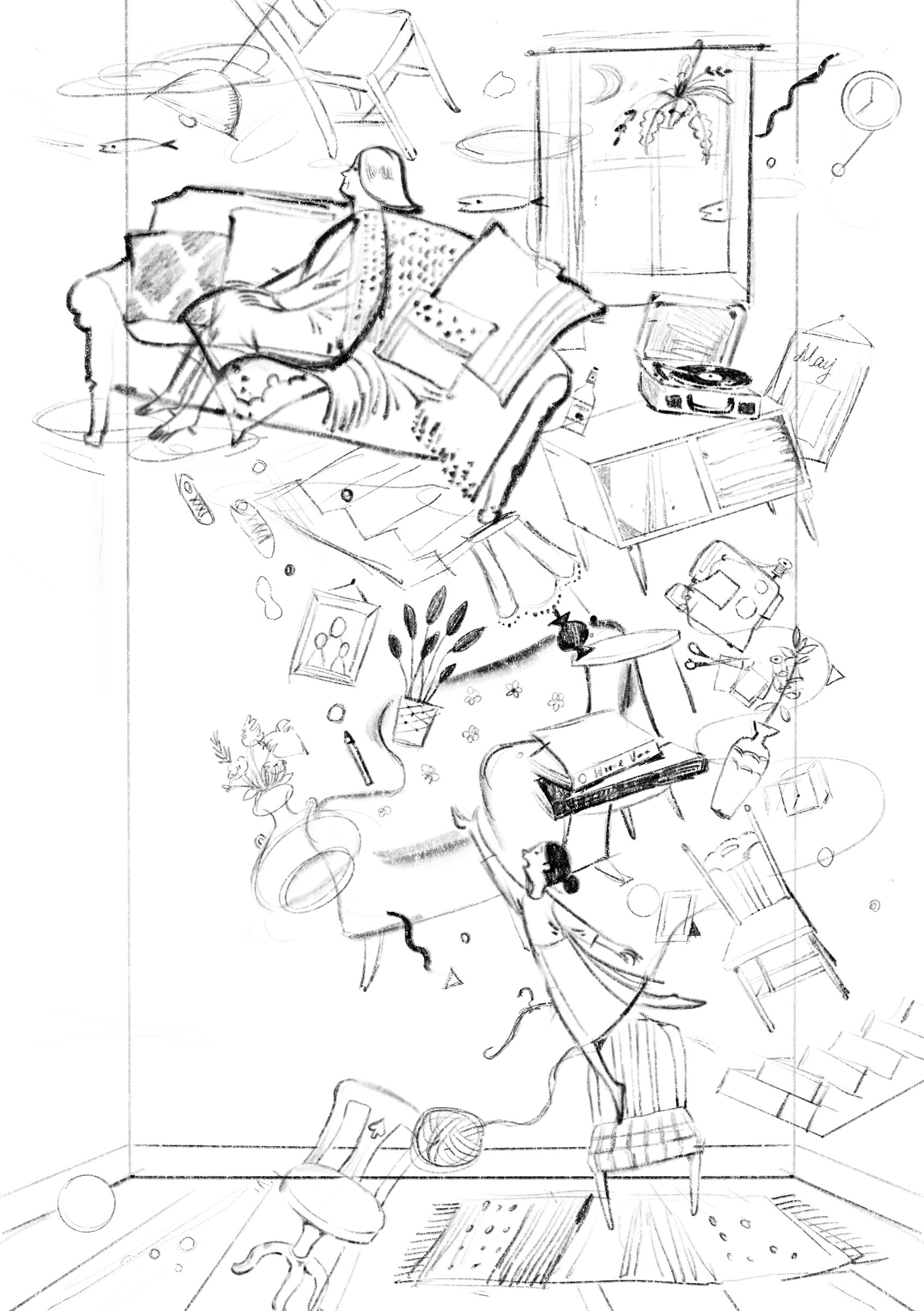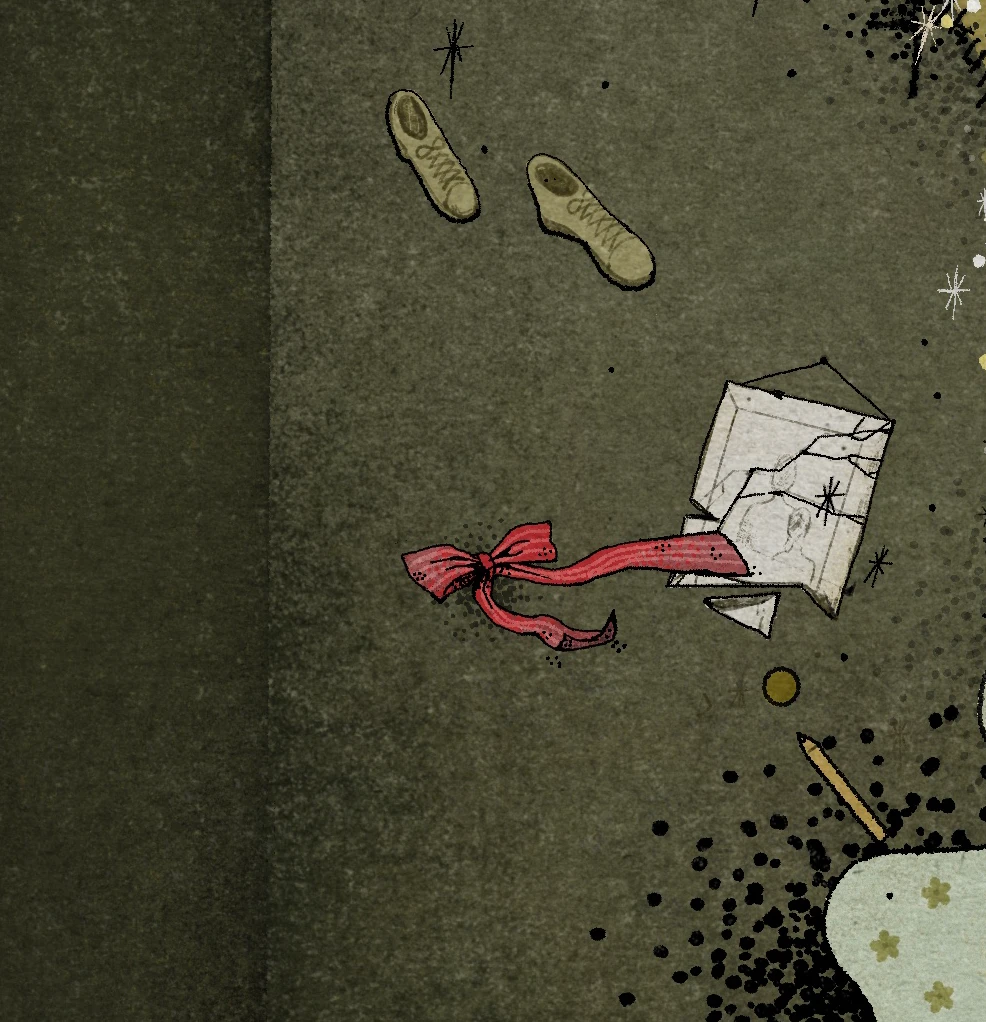 The Interior: Visualizing the futility of caregiving. It captures the tragic moment where the daughter reaches out to catch her falling mother but fails. As the mother is pulled downwards into the void, the "home" dissolves around them, depicting the gravitational pull of forgetting.